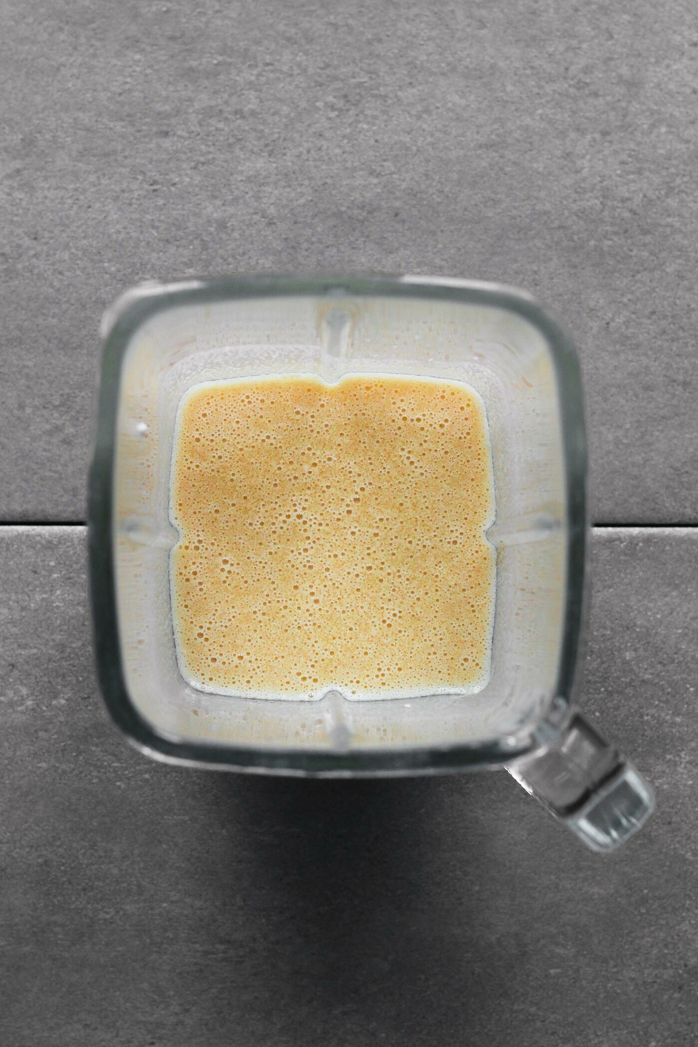- Smelt de kokosolie op middelhoog vuur, en doe het in een blender. Voeg de geweekte cashewmelk, neutrale olie, zonnebloemlecithine, zout en wortelsap toe. Mix op hoge snelheid ongeveer 1 minuut.