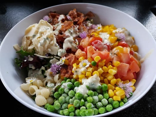 Maak de salade mooi af met wat eetbare bloemen... het oog wil ook wat...