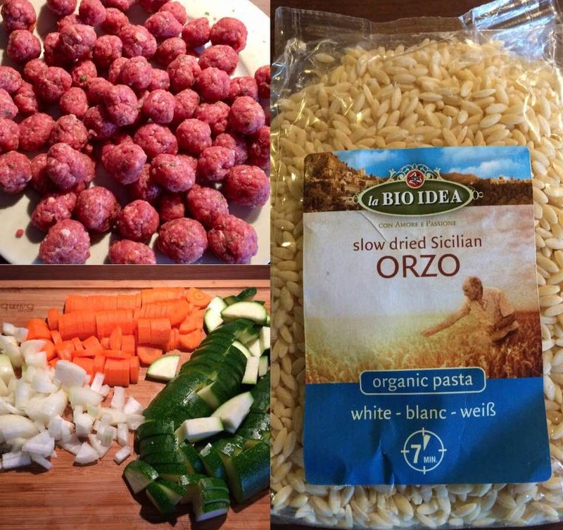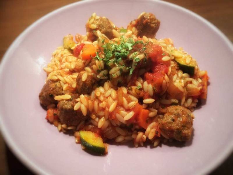 Doe nu de gehaktballetjes bij de tomaten groentesaus samen met de orzo en breng alles nogmaals goed aan de kook.