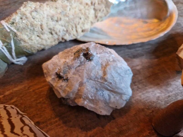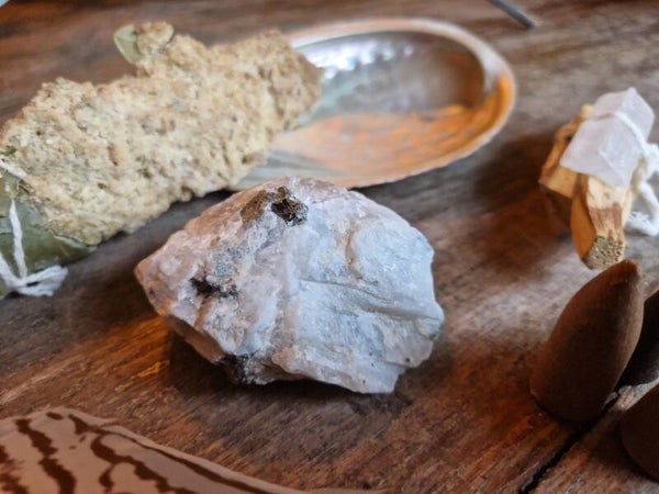 Regenboog maansteen is wit van kleur en vertoont vaak een blauwe gloed. Het wordt vaak gevonden in combinatie met zwarte toermalijn.