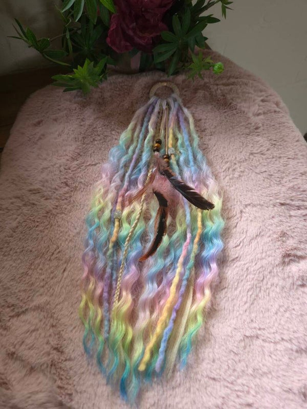 Unieke handgemaakte dreadlock ponytail met dreads, vlechtjes en krullen, bevestigd aan een goed elastiek in bijpassende kleur. Deze kleurrijke haaraccessoire is ideaal voor iedereen die houdt van een natuurlijke, boho of festival look.