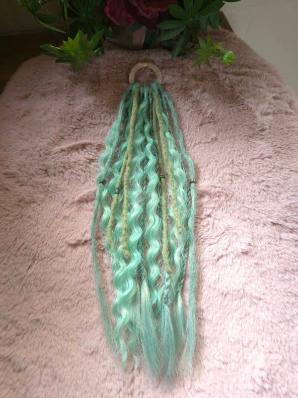 Unieke handgemaakte dreadlock ponytail met dreads, vlechtjes en krullen, bevestigd aan een goed elastiek in bijpassende kleur. Deze kleurrijke haaraccessoire is ideaal voor iedereen die houdt van een natuurlijke, boho of festival look.