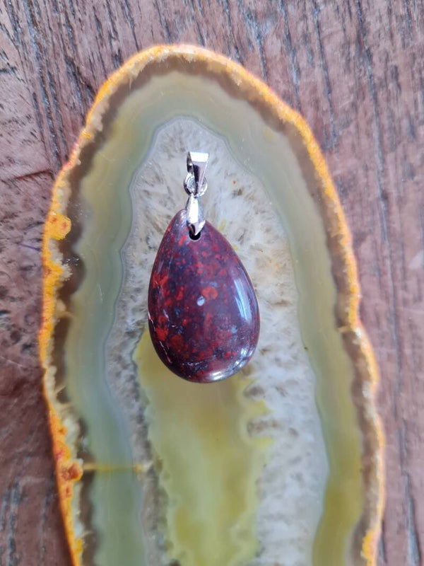 Jaspis breccie is dieprood tot bruinrood van kleur met witte, beige en zwarte vlekken.