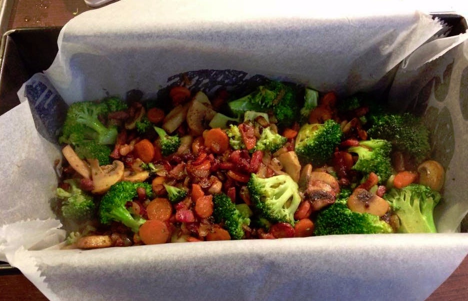 Doe het broccoli mengsel in een brood bakblik, cake bakblik of een kleine taartvorm met bakpapier erin.