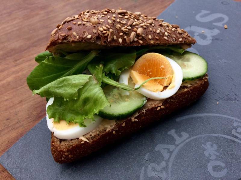 ½ eitje, 4 lekker plakjes komkommer en als laatste een handje gemengde sla. Doe er eventueel wat extra zout en peper op.