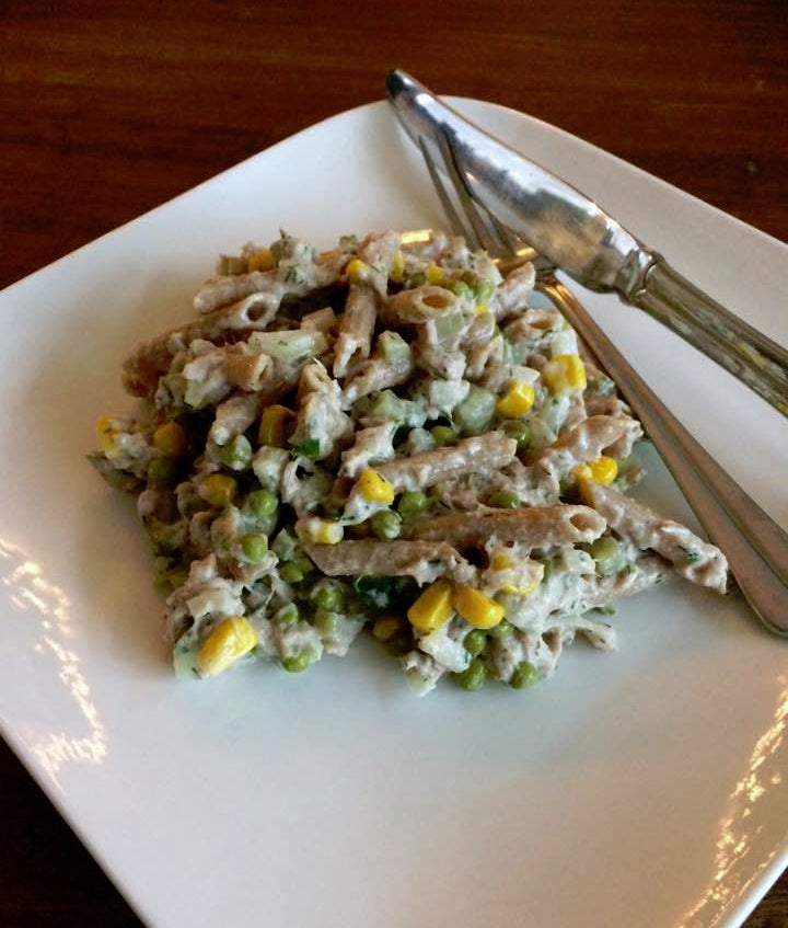 Doe de mayonaise, yoghurt en de ansjovisjes in een beker en blender dit tot een smeuïge massa en verdeel dit over de pasta, roer dit dan goed door elkaar.