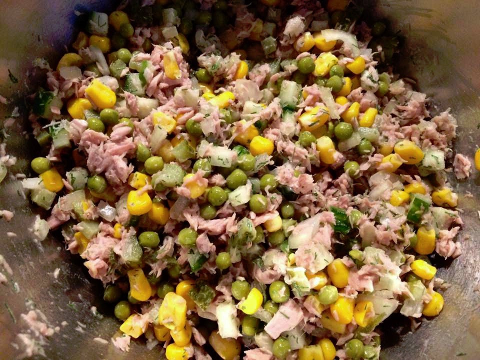 Snij de komkommer en augurken in kleine blokjes en snipper het uitje fijn. Doe alles in een grote kom samen met de rest van de ingrediënten en roer dit goed door elkaar.