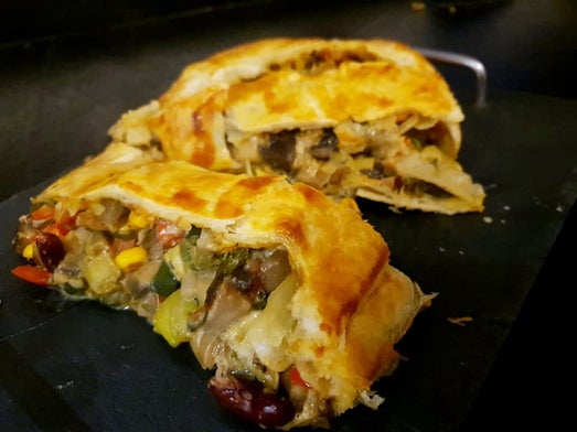 Schep het groenten mengsel op de bladerdeeg en vouw hem mooi dicht. Voor een extra mooi bruin resultaat smeer je de bovenkant in met eigeel of met melk.