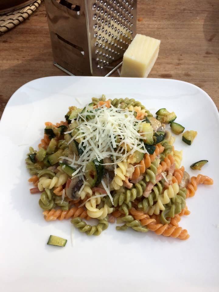 Bak ik een aparte pan de in blokjes gesneden courgette gaar en serveer deze apart bij de rest van de fusilli.