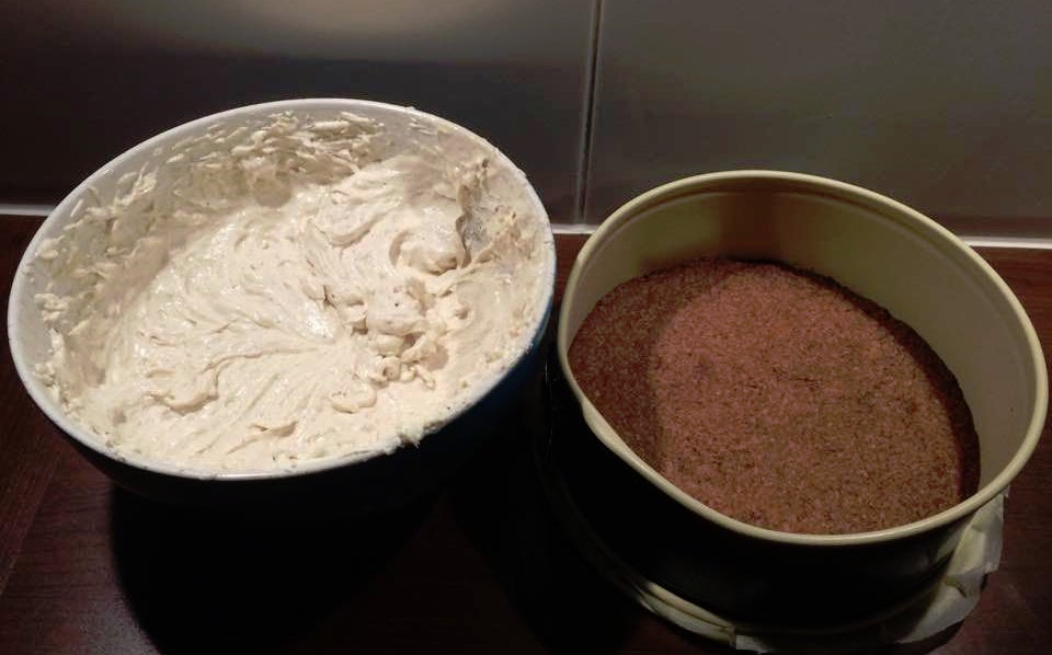 Mix alles goed door met de mixer tot je een mooie egale massa hebt. als de bodem goed is afgekoeld doe je de topping erboven op.
